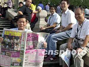 中國首飛航天員楊利偉及載人航天飛行代表團(tuán)到澳門訪問,引起澳門廣大市民的極大興趣,六日上午在大三巴牌坊前,許多市民爭相閱讀有關(guān)新聞。中新社記者:李剛