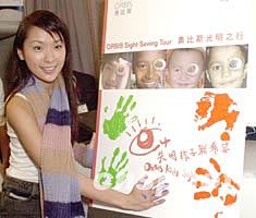 樂(lè)壇新晉歌手鄧肇欣11月6日在香港出席奧比斯眼科飛機(jī)醫(yī)院《"讓我看見(jiàn)世界"關(guān)注失明兒童行動(dòng)》啟動(dòng)儀式,在布景板蓋上手印,象征支持行動(dòng)。中新社記者:鄧慶樂(lè)