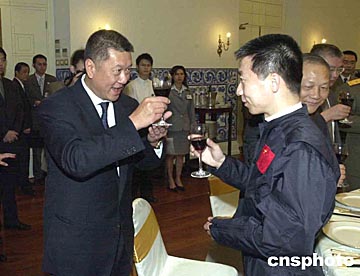 澳門特區(qū)政府五日在政府總部舉行歡迎晚宴,歡迎國家首飛航天員楊利偉和中國載人航天代表團(tuán)訪澳,圖為行政長官何厚鏵在歡迎晚宴上向楊利偉祝酒。中新社記者:李剛