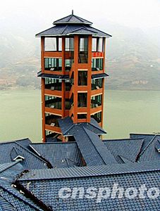 重慶市奉節(jié)縣移民新城在整體建設(shè)上重視繼承和發(fā)揚民族文化建筑傳統(tǒng),并于近期在該縣魚腹試驗區(qū)修建了一批古建筑群,集中再現(xiàn)當?shù)鬲毦咛厣拿袼孜幕。圖為已竣工的夔門大酒店“攬月樓”,造型別致,具有土家山寨風(fēng)格之韻。作者:周會
