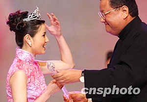 “2003中華小姐環(huán)球大賽”總決賽11月8日晚在香港會展中心舉行,經(jīng)角逐來自上海的參賽選手江欣榮獲中華小姐大賽冠軍。中新社記者:錢興強