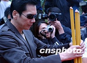 香港藝員劉青云、周聰在拜神儀式上。 中新社記者:錢興強