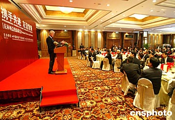 美國(guó)前總統(tǒng)克林頓十一月十一日在北京國(guó)際俱樂(lè)部飯店出席演講會(huì),向中外人士宣講中美攜手共進(jìn),友誼常青。