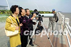 10日首次來廈門與養(yǎng)子傅宗漢相會的92歲金門老大娘翁李榮旦在兩家親人的陪同下,游覽廈門名勝古跡及新景觀廈門環(huán)島路、會展中心等地。圖為金門老大娘翁李榮旦在廈門環(huán)島路通過高倍望遠(yuǎn)鏡觀看金門。作者:向天
