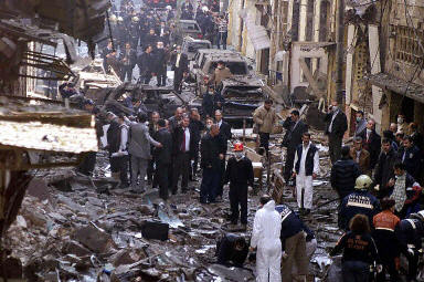 法新社則報(bào)道,在出事的畢宇格魯?shù)貐^(qū),被炸的“Neve Shalom”猶太教堂的墻面遭炸后大片塌落,兩具尸體躺在教堂前,身上蓋著紙,附近留著血。附近一名作坊工人稱,爆炸聲震耳欲聾。