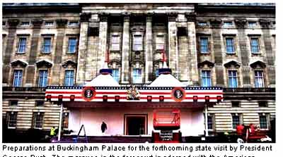 與此同時(shí),英國(guó)人的抗議活動(dòng)逐漸升級(jí)。昨天傍晚,警方逮捕了一名爬上白金漢宮大門(mén)的抗議者。她名叫林迪斯·普爾西,她在下午四點(diǎn)鐘的時(shí)候爬上大門(mén)把一幅美國(guó)國(guó)旗倒掛在上面。國(guó)旗上還寫(xiě)著抗議布什訪英的標(biāo)語(yǔ)。她在被警方逮捕之前在大門(mén)上坐了兩個(gè)小時(shí)。