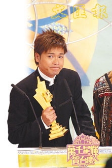 而“我最喜愛的男主角”一獎(jiǎng)中,賽前穩(wěn)操勝券的郭晉安眾望所歸,憑借對(duì)《憨夫成龍》里“阿旺”一角的出色表演奪獎(jiǎng)。領(lǐng)獎(jiǎng)時(shí)刻他激動(dòng)地感謝17年來(lái)支持他的人。郭晉安特別表示﹕“當(dāng)任何人都不相信我有機(jī)會(huì)站在頒獎(jiǎng)臺(tái)做男主角時(shí),很感謝梁家樹(無(wú)線戲劇組高層)給予我信心!