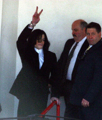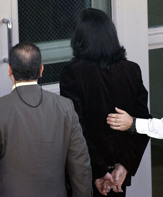 邁克爾-杰克遜在雙手被手銬銬住的情況下,由警方和私人律師陪同進入圣巴巴拉警察局。
