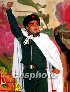 河南省安陽市超越集團在日前舉辦的一場“非公經(jīng)濟之春”文藝晚會上,上演當年樣板戲《智取威虎山》中的共產(chǎn)黨員形象。超越集團有健全的共產(chǎn)黨組織健全。中新社記者:宋吉河