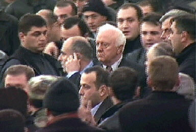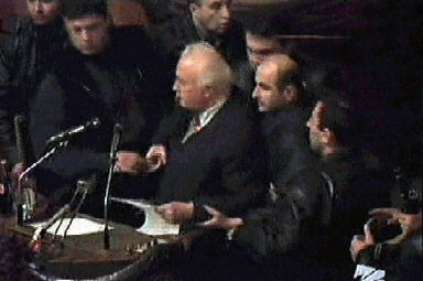 11月22日,格魯吉亞新一屆議會(huì)舉行第一次會(huì)議。當(dāng)謝瓦爾德納澤在議會(huì)演講時(shí),幾十名反對(duì)派人士沖入議會(huì)大廈,要求總統(tǒng)辭職?偨y(tǒng)的支持者和反對(duì)派人士發(fā)生爭執(zhí),議會(huì)大廳一片混亂。謝瓦爾德納澤隨即在保鏢的保護(hù)下撤離,并表示拒絕辭職。
