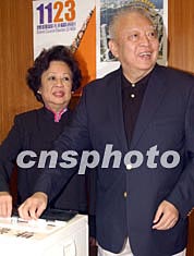 二零零三年香港特別行政區(qū)區(qū)議會選舉投票日十一月二十三日在香港十八個區(qū)同時(shí)進(jìn)行投票選舉,香港特別行政區(qū)行政長官董建華與夫人董趙洪娉一起來到圣若瑟英文書院投票。 中新社記者:錢興強(qiáng)