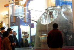 據(jù)悉,已有數(shù)千名北京市民24日來到北京展覽館,觀看在該展會中亮相的“神舟五號”返回艙、主降落傘,還有楊利偉穿過的太空服、吃過的太空食品等。