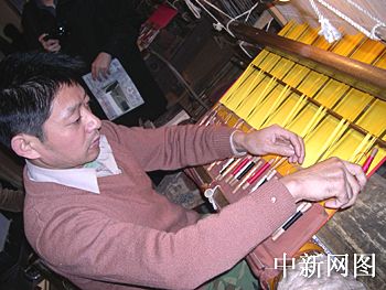織造南京云錦的老式提花木機(jī),每臺(tái)織機(jī)須有提花工和織造工兩人配合,前者在上,后者在下,上下協(xié)同生產(chǎn)。兩人勞作一天,僅能織造云錦五厘米長(zhǎng)。
