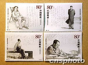 為紀(jì)念毛澤東同志誕辰110周年,中國國家郵政定于12月6日發(fā)行《毛澤東同志誕生一百一十周年》紀(jì)念郵票一套4枚,四枚郵票的圖案名稱分別為:毛澤東在西柏坡、毛澤東在北戴河、毛澤東在廬山、毛澤東在廣州,面值均為80分。中新社記者:鄒憲