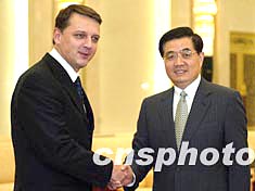 胡錦濤指出,中斯兩國都致力于走適合本國國情的發(fā)展道路。中國已進入全面建設小康社會新階段。斯實行穩(wěn)定發(fā)展的經(jīng)濟戰(zhàn)略,推進漸進式改革。這為雙方開展全方位務實合作提供了良好機遇,也有助于不同發(fā)展模式的相互交流和借鑒。中方愿本著相互尊重、平等互利的原則,與斯方共同努力,不斷擴大合作領域,豐富合作內(nèi)容,推動兩國關系全面深入地向前發(fā)展。