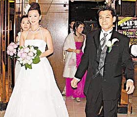 婚禮酒會開始時,身穿婚紗的翁虹與新郎伍偉杰在現(xiàn)場鋼琴和小提琴伴奏下進場,一對新人進行交換戒指及祝酒儀式后,再由雙方家長上臺致辭,然后新郎哥便輕吻新娘子面頰宣示禮成,其間翁虹一度感觸至兩眼通紅,場面溫馨。