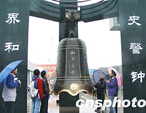 由南京鋼鐵集團(tuán)澆鑄的“和平大鐘”十二月十一日正式落戶南京大屠殺遇難同胞紀(jì)念館,以銘記歷史教訓(xùn),祈禱世界和平。大鐘高3米,寓意紀(jì)念30萬遇難同胞;總重量6.6噸,表示大鐘于南京大屠殺遇難者66周年祭日鑄建;下擺口徑為1.937米,意為日軍全面侵華及南京大屠殺發(fā)生的年份。該鐘外形仿明式青銅古鐘樣式,鐘體正面是著名書法家啟功書寫的“和平大鐘”鐘名,背面刻有“前事不忘、后事之師,以史為鑒、開創(chuàng)未來”16個大字,兩側(cè)分別刻有銘文和浮雕。作者:丁梅
