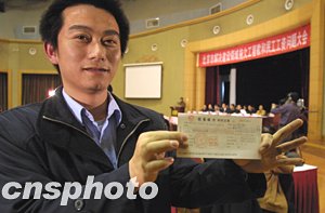 北京市政府十二日在京召開“北京市解決建設(shè)領(lǐng)域拖欠工程款和民工工資問題大會(huì)”,北京市建筑施工企業(yè)向外地進(jìn)京勞務(wù)企業(yè)集中兌付勞務(wù)費(fèi)12.6億元。南通某勞務(wù)公司代表手持現(xiàn)場(chǎng)兌付的150萬元支票高興地向記者展示。中新社記者:廖文靜