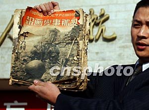 也在今天,幾本揭露當(dāng)年侵華日軍罪行的畫冊由溫州晚報社贈送給抗戰(zhàn)紀(jì)念館。這家報社的編輯周麗峰介紹,這幾本發(fā)黃的《支那事變畫報》系日本朝日新聞社出版,今年十一月被溫州經(jīng)營紙盒加工的企業(yè)從進(jìn)口的日本廢紙中發(fā)現(xiàn),畫冊中報道了一九三七年以后日軍在北平、天津、漢口、安慶等地的一系列軍事行動。