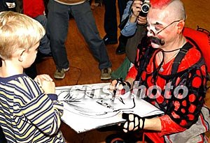 來自俄羅斯的莫斯科馬戲團十二月十六日在香港舉行的演出發(fā)布會,在香港一家商場里馬戲團小丑為小朋友即興畫像。中新社記者:錢興強