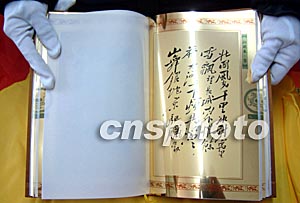 為紀(jì)念毛澤東誕辰110周年,由中央文獻(xiàn)出版社出版的純金版《毛澤東詩詞手跡》十六日在蘇州限量發(fā)行。金書以純度達(dá)99.9%的黃金紙為材質(zhì),詩詞集為古籍16開本,封面上鑲嵌著純金的毛澤東頭像紀(jì)念章,36頁金紙收錄了《沁園春·雪》等17幅毛澤東詩詞手跡。這部金書海內(nèi)外限量發(fā)行5000套,每套定價18600元人民幣。作者:蔣振江