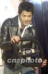 歌星郭富城12月18日在香港出席諾基亞7600流動(dòng)電話推廣活動(dòng),郭富城一向鐘愛(ài)跑車,大會(huì)特別送上印有新手機(jī)標(biāo)識(shí)的方向盤(pán)給他。作者:鄧慶樂(lè)