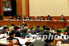 中共中央政治局委員王兆國(guó),二十二日在十屆全國(guó)人大常委會(huì)第六次會(huì)議上作中共中央關(guān)于修改憲法部分內(nèi)容建議的說(shuō)明。中新社記者:滿會(huì)喬