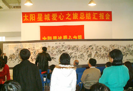 太陽星城愛心之旅隨團(tuán)著名畫家李繁民,傾心力作了八米巨畫《中華五十六駿圖》贈(zèng)送給香港冠城集團(tuán),以表達(dá)對企業(yè)支持愛心事業(yè)謝意。石家莊殘聯(lián)理事長王金斗專程從河北趕來,代表石家莊市30萬殘疾人對太陽星城愛心之旅采訪團(tuán)的奉獻(xiàn)精神表示感謝。在報(bào)告會(huì)舉行之際,太陽星城愛心之旅所到之處的各級(jí)殘聯(lián)、志愿者組織和愛心人士發(fā)來了一百多封賀信。