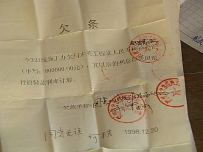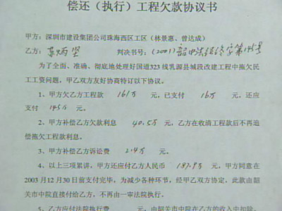 林景惠:“民工投勞力,還有一些小老板也代資。比如我們請(qǐng)下面的包工頭,給我們完成工程的話,我們第二步就給股份。第二步就答應(yīng)在一年內(nèi)加銀行利息,加倍的銀行利息給他們!睋(jù)調(diào)查,自1999年底新股東進(jìn)入后,合作三方股東打起了官司,一些包工頭和民工代表為追回工錢(qián),也將丙方告上了法庭,2001年,韶關(guān)中級(jí)人民法院執(zhí)行了財(cái)產(chǎn)保全,凍結(jié)了收費(fèi)站的1300萬(wàn)元收費(fèi)款。林景惠:“有約定完工過(guò)后就付清所有我的工資部分,付清80%剩余的部分就在六個(gè)月之內(nèi)全部付清。1996年6月份我就全部把工做完了,做完了就一直等錢(qián),一直等到現(xiàn)在!庇浾撸骸耙荒暌院蠊こ掏旯ち耍悄銈儏s沒(méi)有能力來(lái)支付民工這筆錢(qián)?”林景惠:“沒(méi)辦法。說(shuō)實(shí)話對(duì)民工這個(gè)欠款我是深表同情的,所以從1996年開(kāi)始全部收入基本上來(lái)講,就給這個(gè)工程隊(duì)我們都有付的清單!庇浾咴谑召M(fèi)站采訪時(shí),正碰到幾個(gè)民工拿著判決書(shū)來(lái)討工錢(qián)。在調(diào)查中記者發(fā)現(xiàn),有些判決已生效3年多,但民工還是沒(méi)有拿到工錢(qián)。記者:“這些錢(qián)全部就給了施工隊(duì),付給施工隊(duì),施工隊(duì)總共欠了才一千多萬(wàn)。你這兩千多萬(wàn)都給他了,那就應(yīng)該說(shuō)是早還清了,實(shí)際上你們欠了不止一千多萬(wàn)。”民工:“實(shí)際不止,所欠的款項(xiàng)應(yīng)該是達(dá)到了三千萬(wàn)吧,兩千多萬(wàn)、三千萬(wàn)左右!