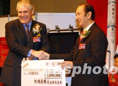 特備展覽“中國首次載人航天飛行展Ⅱ--給香港的禮物”十二月二十三日在香港科學(xué)館開幕,圖為何鴻燊博士在展覽開幕儀式上向香港公益金捐款。中新社記者:錢興強(qiáng)