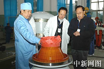 “長征二號丙”改進型運載火箭總指揮鄭全寶(中)、總設計師李占奎(右)查看火箭上面級發(fā)動機。荊鷹 攝