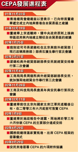 在二零零三年六月簽署的CEPA包括貨物貿(mào)易、服務(wù)貿(mào)易和貿(mào)易投資便利化三部分。其中,貨物貿(mào)易部分規(guī)定,自二零零四年一月一日起,對(duì)輸往內(nèi)地的二百七十三種原產(chǎn)于香港的貨物實(shí)行零關(guān)稅。(戴慶成)