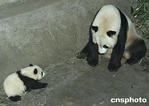 2004年新年鐘聲敲響前的2003年12月31日晚,出生整整一百三十天的北京動物園大熊貓“甜甜”在媽媽“妞妞”期待的目光和輕聲的召喚聲中,搖搖晃晃一步一步向前走。“甜甜”2003年8月24日在北京動物園出生,目前的體重已經(jīng)從出生時的150克增長到8,060克,預(yù)計(jì)在半周歲后斷奶離開媽媽獨(dú)立生活。中新社記者:任晨鳴
