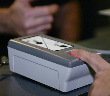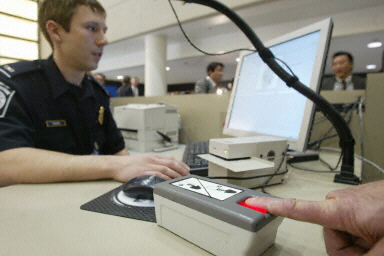 2004年1月5日,在洛杉磯國際機(jī)場(chǎng),美國海關(guān)及邊境安全部門的官員展示新的指紋識(shí)別及拍照系統(tǒng)。從5日起,美國全境將推廣使用該系統(tǒng),對(duì)進(jìn)入美國的外國游客進(jìn)行身份識(shí)別。