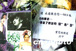 香港著名藝人梅艷芳喪禮將于1月11日設靈, 12日出殯,10日各地歌迷陸續(xù)來到香港殯儀館以各種形式悼念香港歌后梅艷芳.圖為歌迷寫上懷念的心意卡。中新社記者:洪少葵