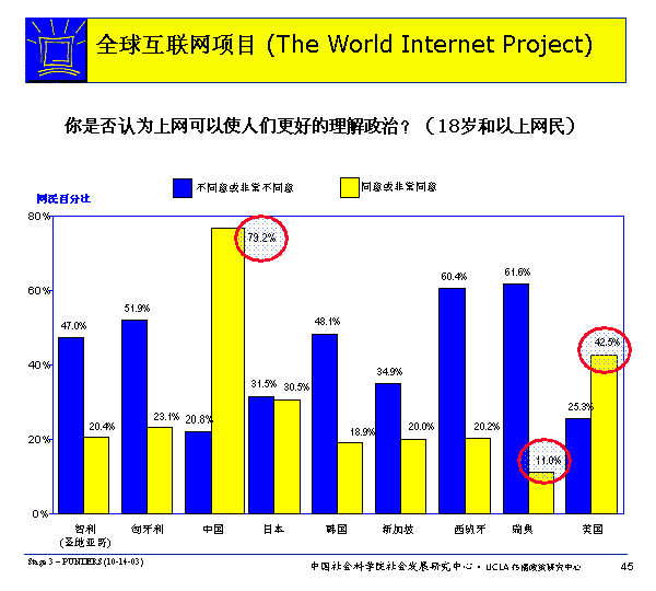 總的來說,多數(shù)國家的網(wǎng)民有一個共同的趨向:更多的人相信互聯(lián)網(wǎng)能夠幫助人們理解政治事件,而不是給與他們更多的政治權(quán)利。