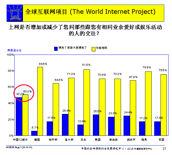 然而,還是有相當(dāng)數(shù)量的網(wǎng)民認(rèn)為使用互聯(lián)網(wǎng)增加了他們同跟他們有相同業(yè)余愛好或相同娛樂活動(dòng)的人的交往;這樣的網(wǎng)民在中國最多,47.2%被調(diào)查的中國互聯(lián)網(wǎng)網(wǎng)民認(rèn)為互聯(lián)網(wǎng)增加了增加或極大的增加了交往。