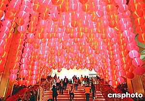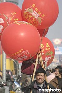 春節(jié)臨近,江蘇走街串巷的貨郎趁著年關(guān)人們購置年貨的機會,扛著高高的氣球穿行于街道,等待著買賣的到來。中新社記者:高遠