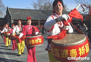 猴年臨近,來自河南新鄉(xiāng)王官營風(fēng)雷盤鼓藝術(shù)團的團員們二十日在北京北海公園表演盤鼓,營造熱烈的佳節(jié)氣氛。中新社記者:張勤