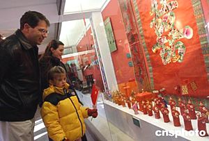 第三屆北京民俗文化節(jié)暨第六屆東岳文化廟會在北京古老的東岳廟舉行。其中民俗婚禮展廳展示的中國古代迎親儀仗隊伍的微縮景觀,吸引了一家在中國過春節(jié)的外國游客駐足觀看。中新社記者:張勤