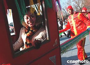 中國農(nóng)歷大年初一,北京各大公園別具特色的廟會活動紅紅火火地開始了,大觀園內(nèi)仿照中國古代新娘出嫁坐花轎的游樂項目,引來許多平日坐慣轎車的現(xiàn)代女性,鉆進(jìn)花轎品嘗舊時“新娘”滋味。中新社記者:王麗南