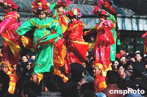 在北京大觀園廟會上,來自山西省大同地區(qū)民間特有的“撓擱”表演,吸引無數(shù)市民駐足觀看。“撓擱”是在一個壯漢身上綁起一根兩米高的鐵桿,頂端安有鐵座,化了妝的男童或女童綁坐在上面,被稱作“撓擱人”。中新社記者:王麗南