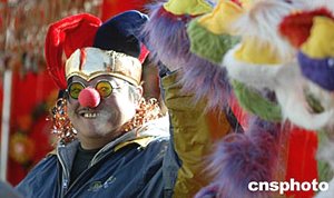 一名商販在剛剛開幕的北京龍?zhí)稄R會上推銷常見于西方節(jié)日的妝飾用品,給傳統(tǒng)的中國廟會增添新鮮色彩。中新社記者:毛建軍