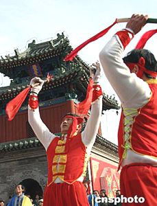 在東岳廟第三屆北京民俗文化節(jié)暨第六屆東岳文化廟會上,來自河南新鄉(xiāng)的農(nóng)民正在表演熱情奔放的乾坤大鼓,慶祝新春的到來。中新社記者:張勤