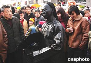 一名身著清朝裝束、渾身涂滿黑碳汁的北京年輕行為藝術(shù)表演者,22日大年初一在北京第四屆廠甸兒廟會上以真假難辨的人體雕塑造型向市民再現(xiàn)舊時市井民俗。中新社記者:鄒憲