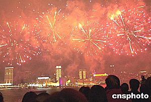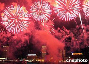 除煙花匯演外,香港新界工商業(yè)總會還在會展中心舉行新春酒會,行政長官董建華、中央政府駐港聯(lián)絡辦副主任周俊明、外交部駐港特派員楊文昌等出席今晚的活動。