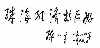 午飯前,小平同志與澳門知名人士馬萬祺及珠海的領(lǐng)導(dǎo)坐在珠海賓館翠城餐廳休息。珠海賓館總經(jīng)理張倩玲想在餐廳中間擺張桌子,請小平同志題詞。李天增對她說,小平同志在深圳也沒有題,現(xiàn)在也不一定會題,還是把桌子擺邊上一點。說完李天增便忙著排座位,回頭一看,鄧小平已主動走過去,伏案揮毫,不暇思索地寫下“珠海經(jīng)濟(jì)特區(qū)好”。