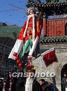 中國農(nóng)歷大年初五,來自河南的農(nóng)民藝術(shù)家身背駕桿,在北京一家廟會表演以“驚、險(xiǎn)、奇、巧”為特色的民間傳統(tǒng)節(jié)目“背樁”。巾幗英雄“穆桂英”的人物造型格外引人注目。中新社記者:張勤