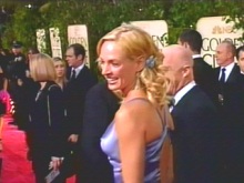 烏瑪舒曼的緞面淡紫色晚禮服,和莎莉塞隆鵝黃色波浪狀晚禮服,在今天也備受贊譽(yù),令二人顯得落落大方。尤其是莎莉塞隆,在經(jīng)歷電影“女魔頭”中天字第一號(hào)宇宙無(wú)敵的超丑妝打扮之后,今天根本就讓觀眾“驚為天人”。