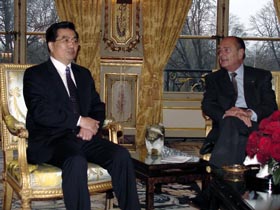 胡錦濤在機(jī)場(chǎng)出席了希拉克主持的隆重歡迎儀式后直接來(lái)到愛(ài)麗舍宮,這是兩國(guó)元首此次訪問(wèn)期間的首次會(huì)談。